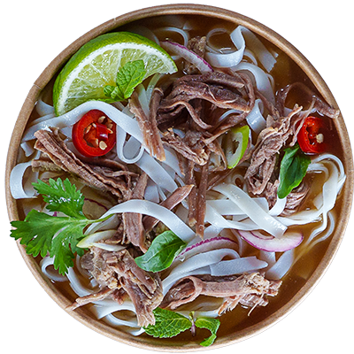 Vietnamese soul food - aromatic broth with two proteins of your choosing, flat rice noodles, red onion, chillies and spring onion. All Pho come with a separate bag of fresh herbs and lime to add to your taste!