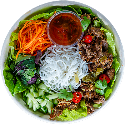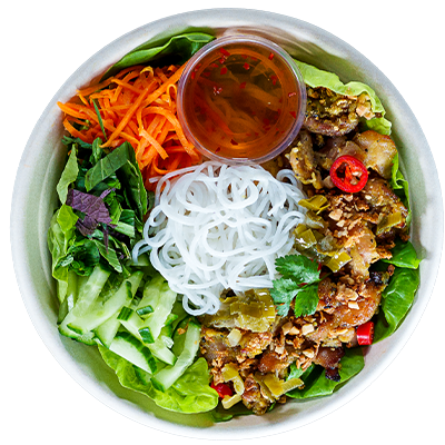 Chargrilled honey roast pork with vermicelli rice noodles. Served with round lettuce salad, pickled carrot, cucumber, crispy shallots, coriander, spring onion oil, sliced chillies, Viet herbs, crushed peanuts and our New Nuoc Cham dressing.