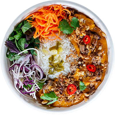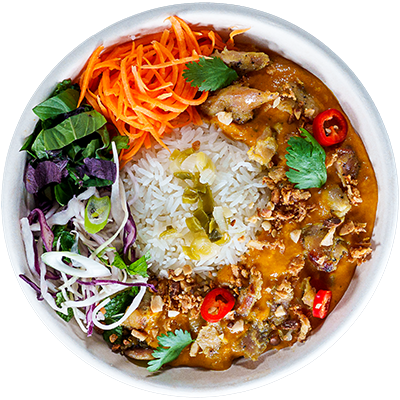 Chicken thigh in a creamy coconut curry. Served with jasmine rice, spring onion oil, crunchy Viet salad, pickled carrot, Viet herbs, crispy shallots, coriander, peanuts and sliced chillies.