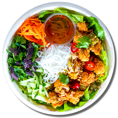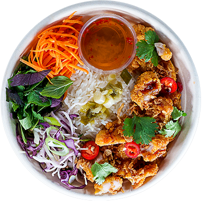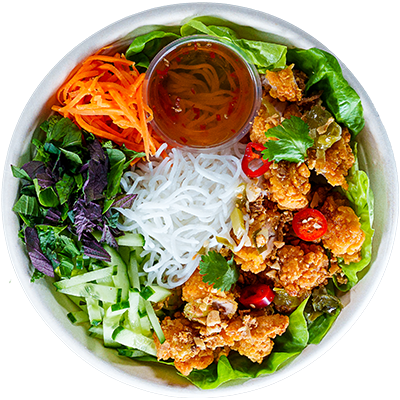 Viet fried chicken with vermicelli rice noodles. Served with caramel fish sauce, round lettuce salad, pickled carrot, cucumber, crispy shallots, coriander, spring onion oil, sliced chillies, Viet herbs, crushed peanuts and our New Nuoc Cham dressing.