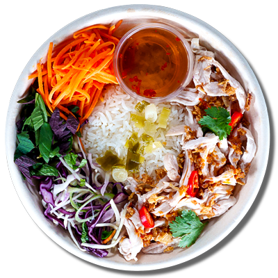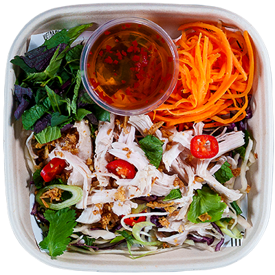 Pulled Chicken Breast with crunchy Viet salad, pickeled carrot, crispy shallots, Viet herbs, coriander, sliced chillies, peanuts and our new Nuoc Cham