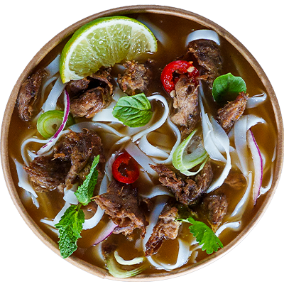 Vietnamese soul food - aromatic broth with our caramel chicken & pulled chicken breast with flat rice noodles, red onion, chillies and spring onion. All Pho come with a separate bag of fresh herbs and lime to add to your taste.