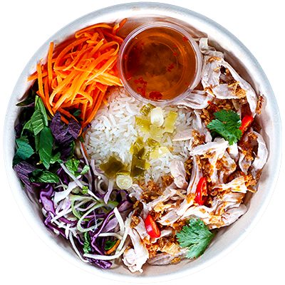 Chargrilled caramel chicken thigh with vermicelli rice noodles. Served with round lettuce salad, pickled carrot, cucumber, crispy shallots, coriander, spring onion oil, sliced chillies, Viet herbs, crushed peanuts and our New Nuoc Cham dressing.