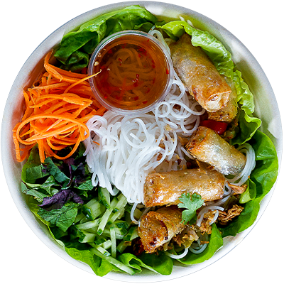 Veg spring rolls with vermicelli rice noodles. Served with round lettuce salad, pickled carrot, cucumber, crispy shallots, coriander, spring onion oil, sliced chillies, Viet herbs, crushed peanuts and our Veg Nuoc Cham dressing.